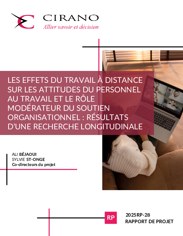 La pandémie de 2020 a forcé de nombreuses personnes à adopter le travail à distance, au Québec comme ailleurs au Canada et dans le monde. Aujourd’hui, bon nombre d’entre elles continuent de travailler à distance, au moins partiellement. Une équipe du CIRANO a mené une étude longitudinale novatrice menée par questionnaires auprès du personnel de plusieurs organisations partenaires. Ce rapport résume les principaux résultats bivariés et multivariés des trois phases du projet mené au Québec à l’été 2022, au printemps 2023 et à l’hiver 2024. Enfin, il présente une analyse des effets modérateurs du soutien offert au personnel par l’organisation, la supervision immédiate et les collègues sur les liens entre le nombre de jours de travail à distance par semaine et divers résultats attitudinaux d’intérêt pour les employeurs (p. ex., l’engagement, la productivité, etc.). Nos résultats permettent de fournir des données probantes et de proposer des recommandations pour aider les employeurs à gérer leur personnel dans un contexte de travail hybride.